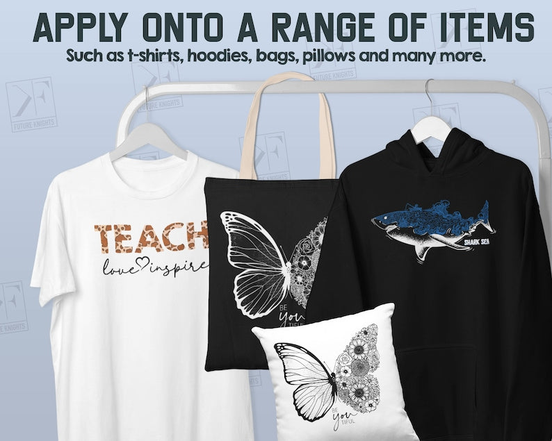 To Apply. Simply press them with a heat press at 150C or 300F for 15 seconds, peel the film once it has cooled completely. We do not accept returns or cancellations. We will fix any issue that occurs due to our error. Wash on cold with garment inside out. Use mild detergent. Never bleach. Hang to dry. Do not machine dry.