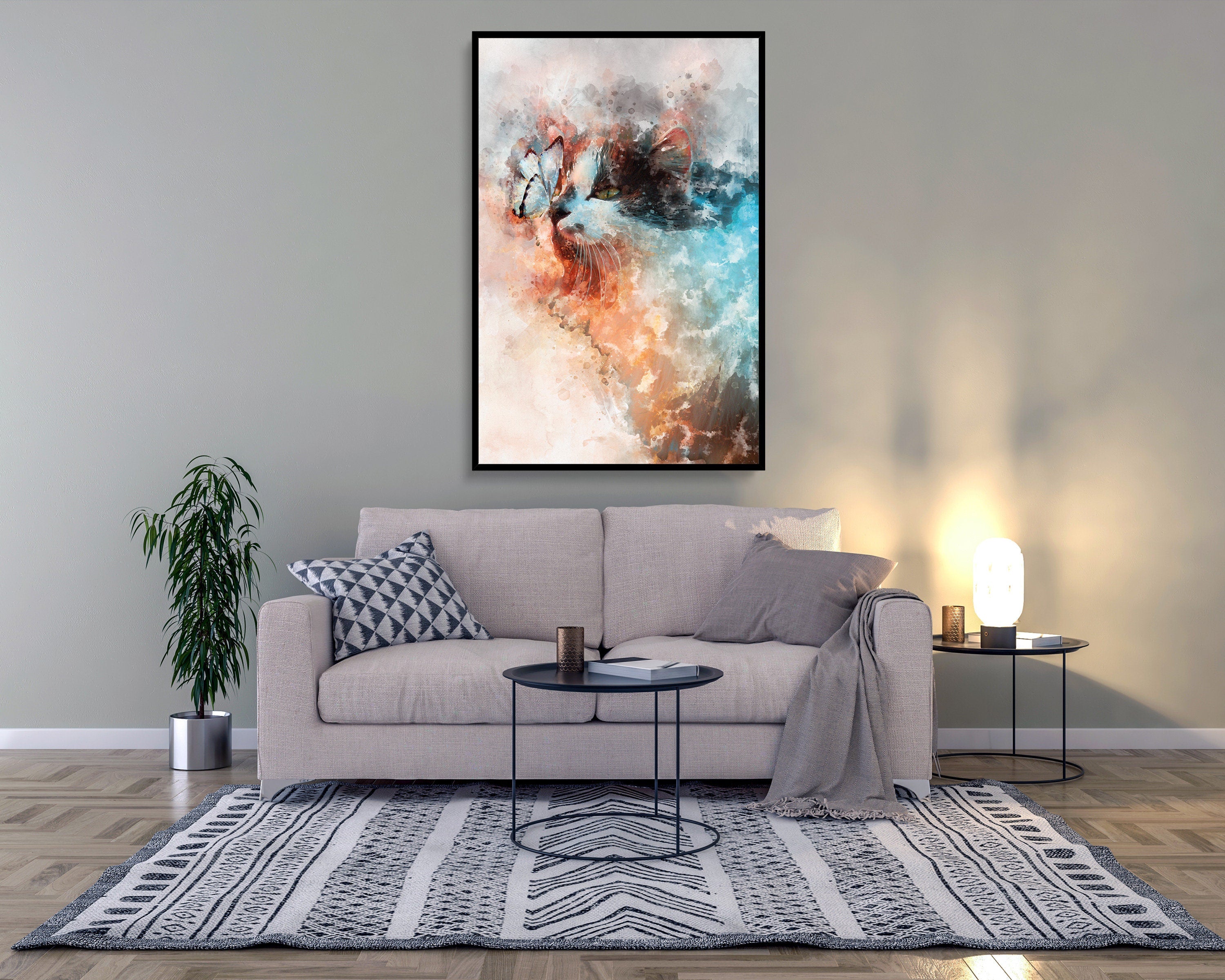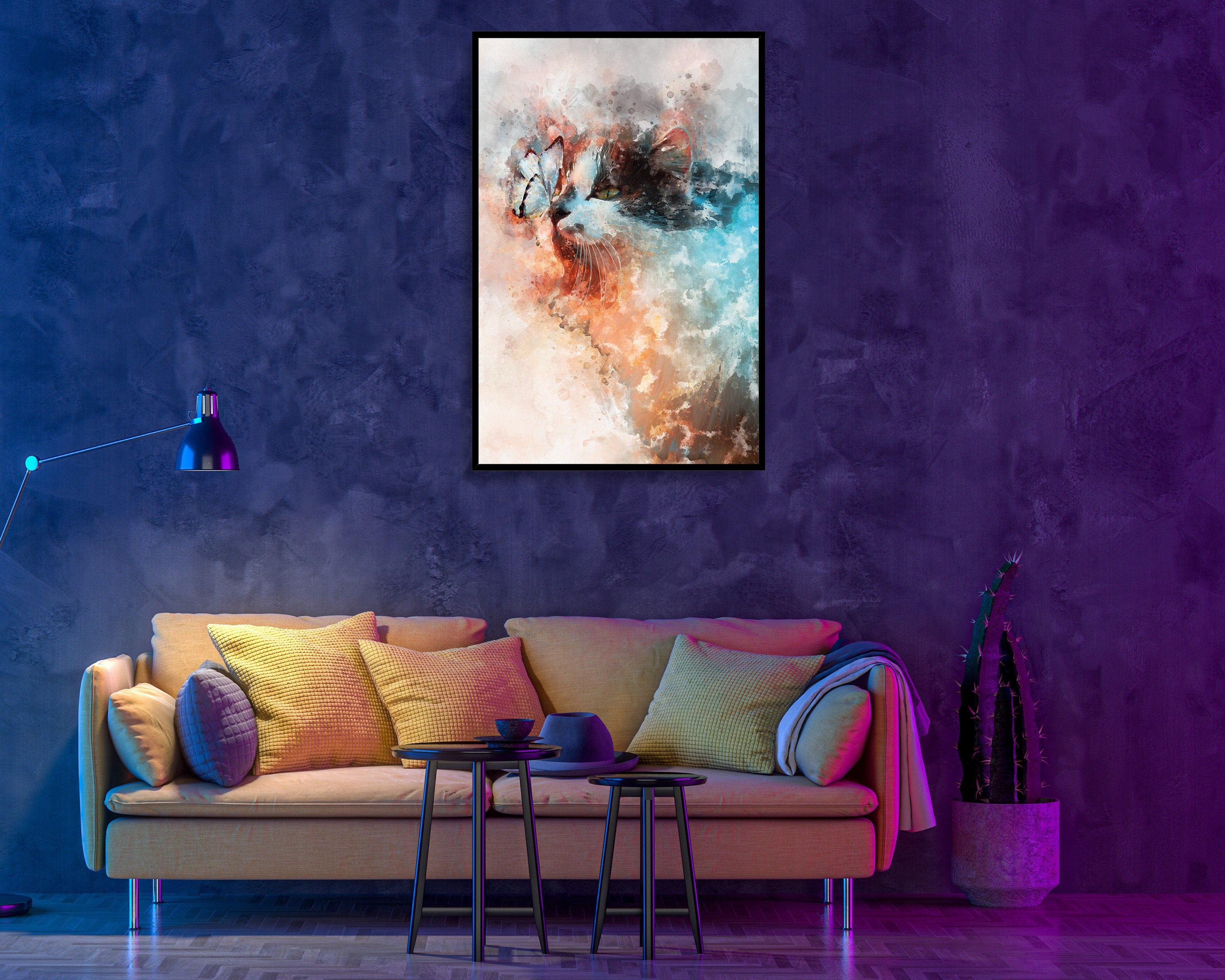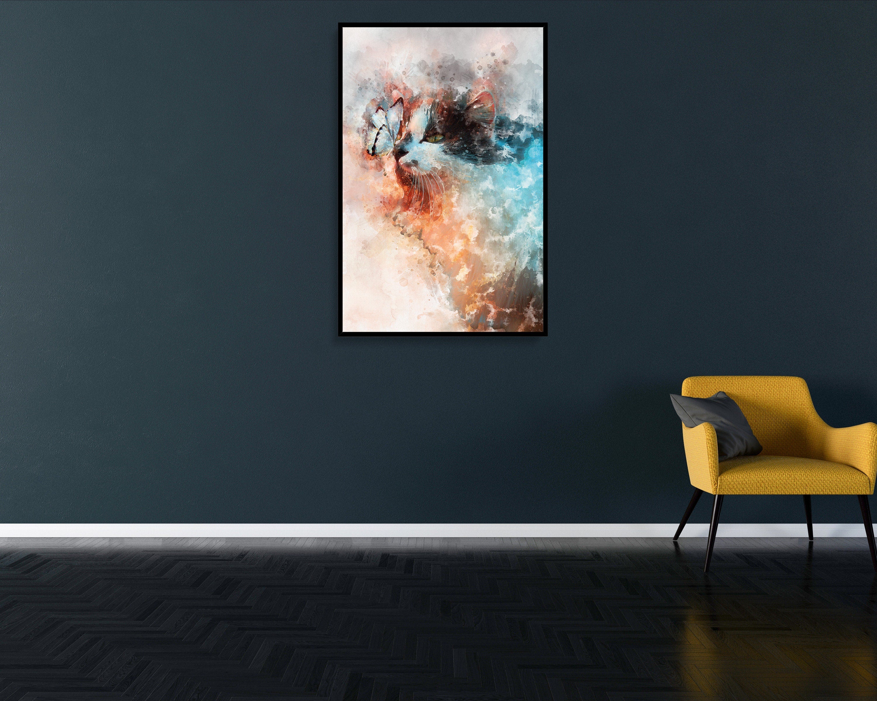 Design:> Made by spe3dy productions, one of a kind. Material:> Satin premium poster material 220 GSM / Mimaki original Eco Solv-Inks Art:> Real Butterfly & Cat mixed with watercolour effect Art, unique and different.