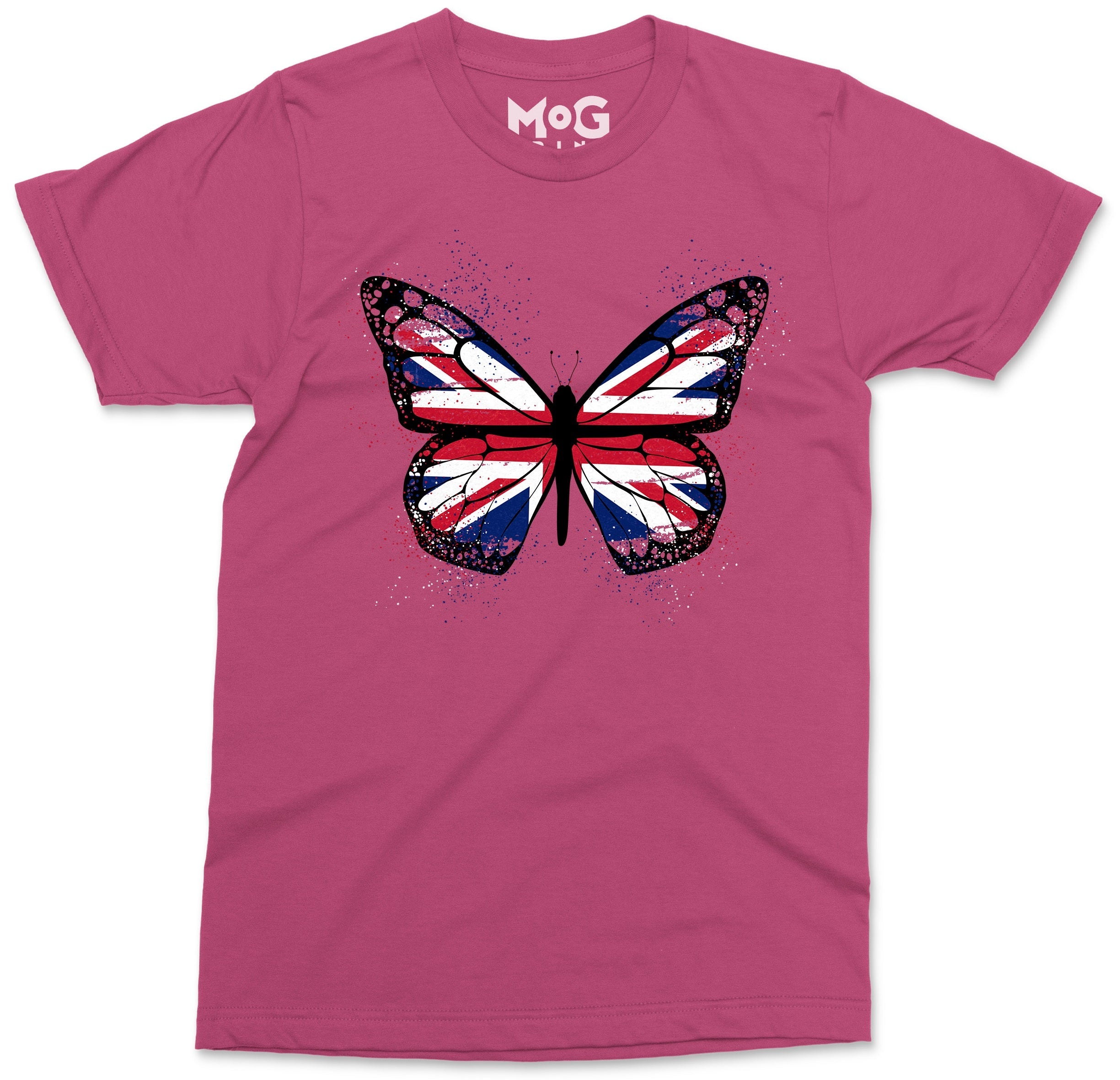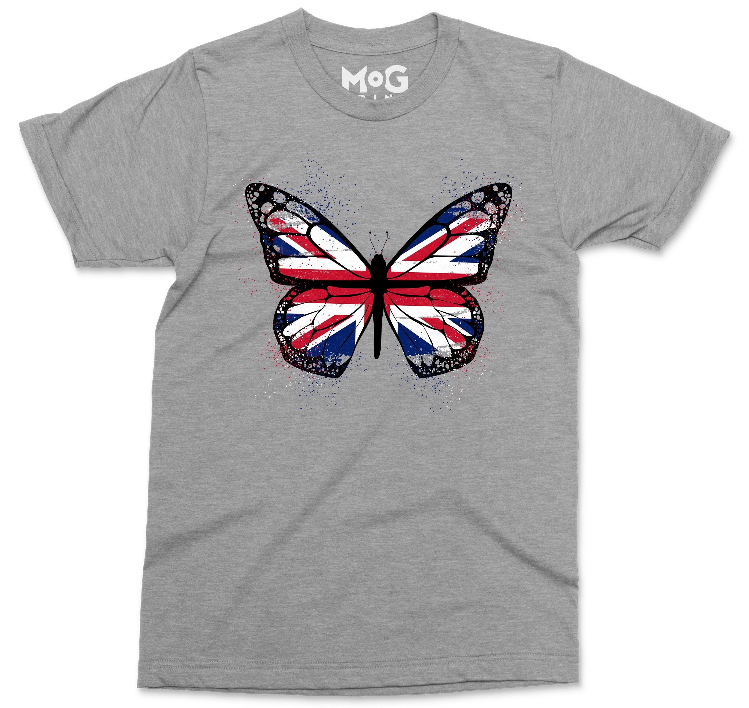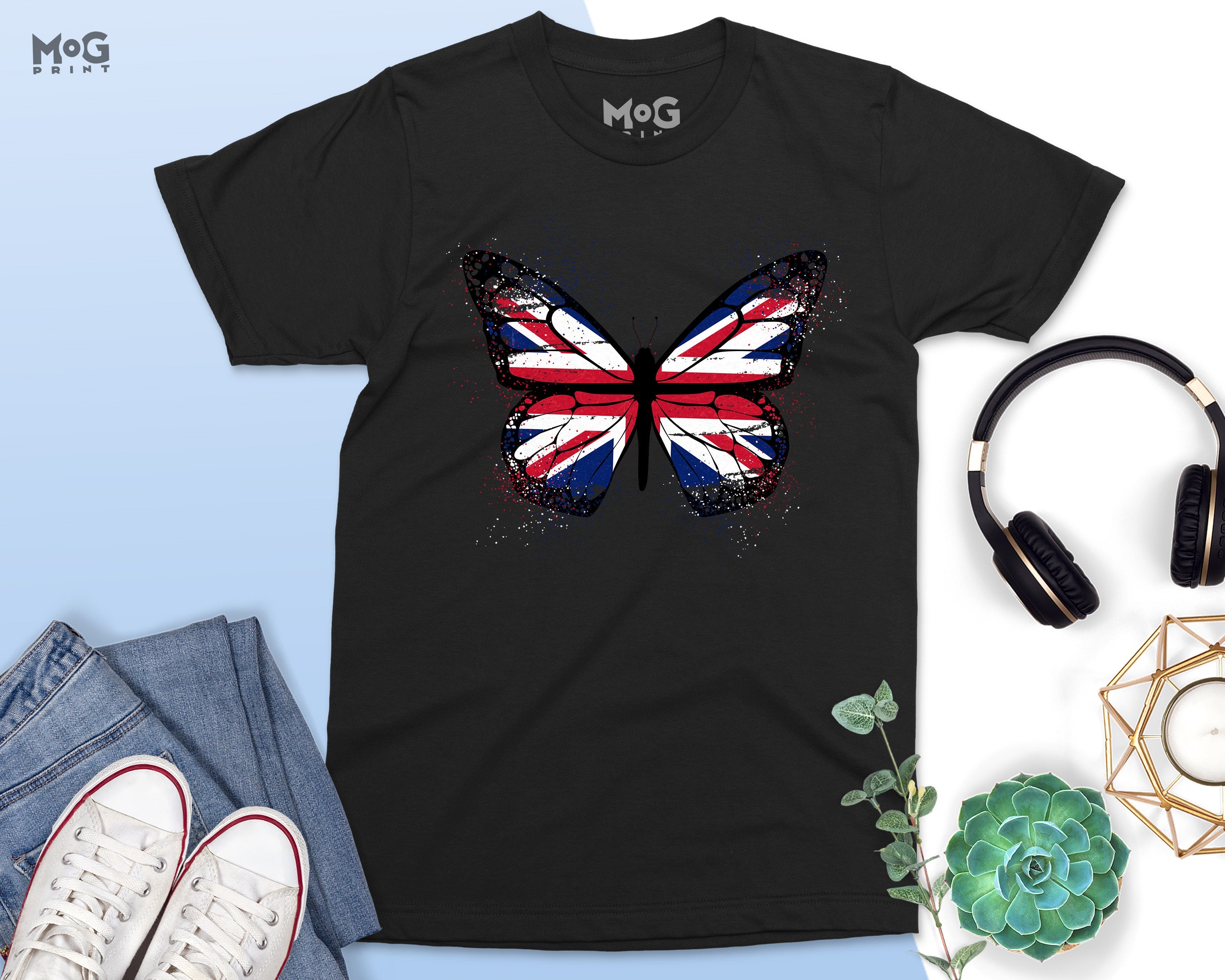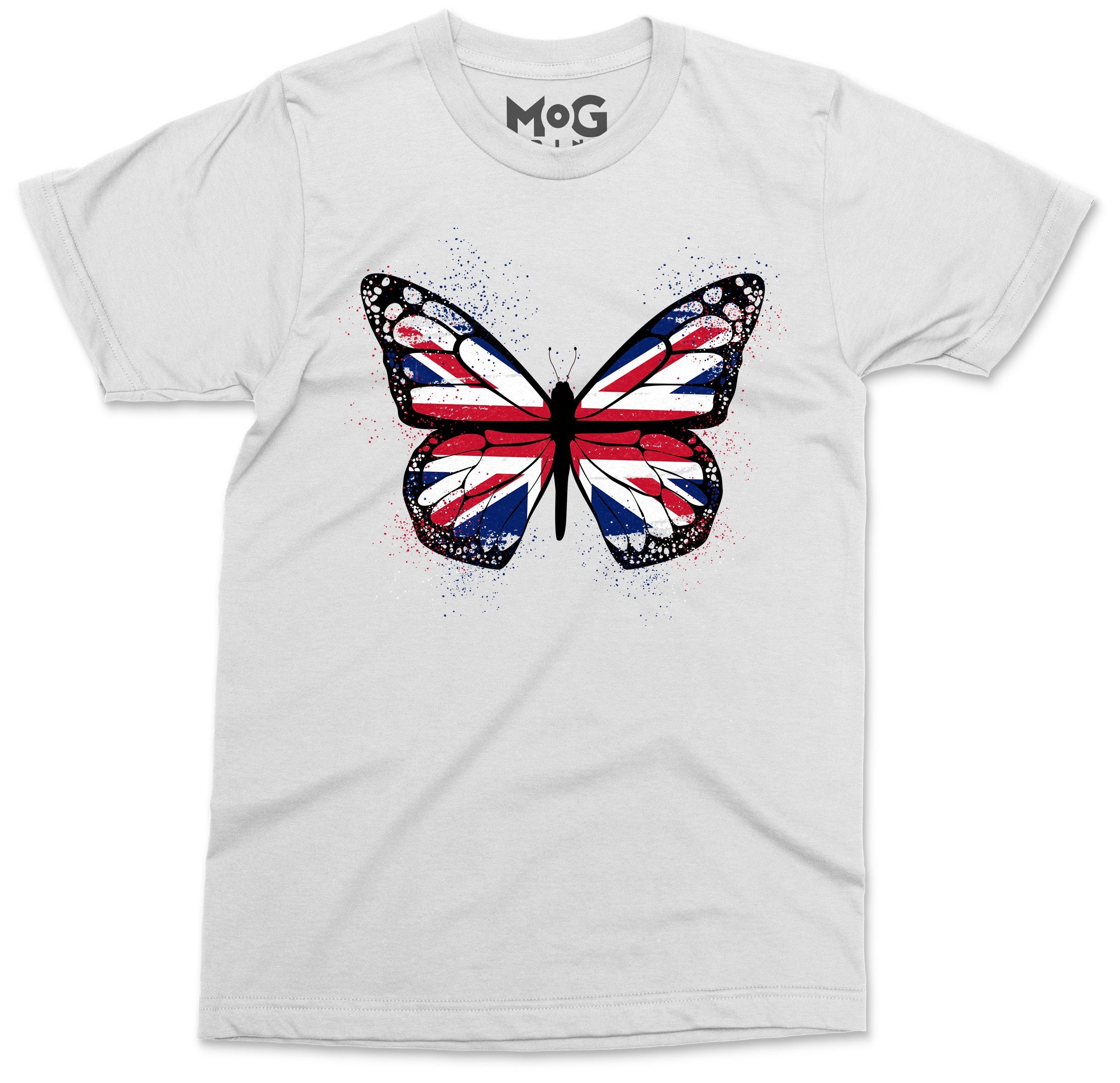 Butterfly UK Flag Graphic T-shirt, Union Jack England Tour Souvenir Memorabilia Gift Top For Men Women, Splash Streetwear Insect Tee