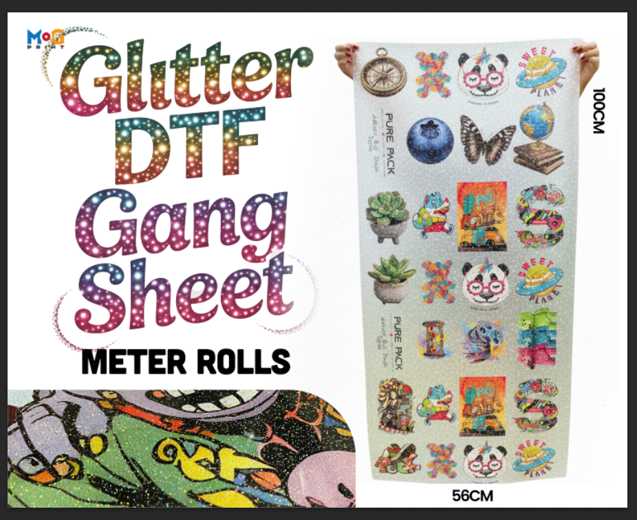 Add a touch of sparkle to your custom apparel with our premium Glitter DTF Gang Metre Sheets, printed in a generous 100x56cm format. Designed for fashion brands, print shops, crafters, and on-demand businesses, these heat-press-ready glitter transfers deliver bold, full-color designs that shimmer and shine on 100% cotton, polyester, poly-cotton blends, canvas, twill, denim, and more.