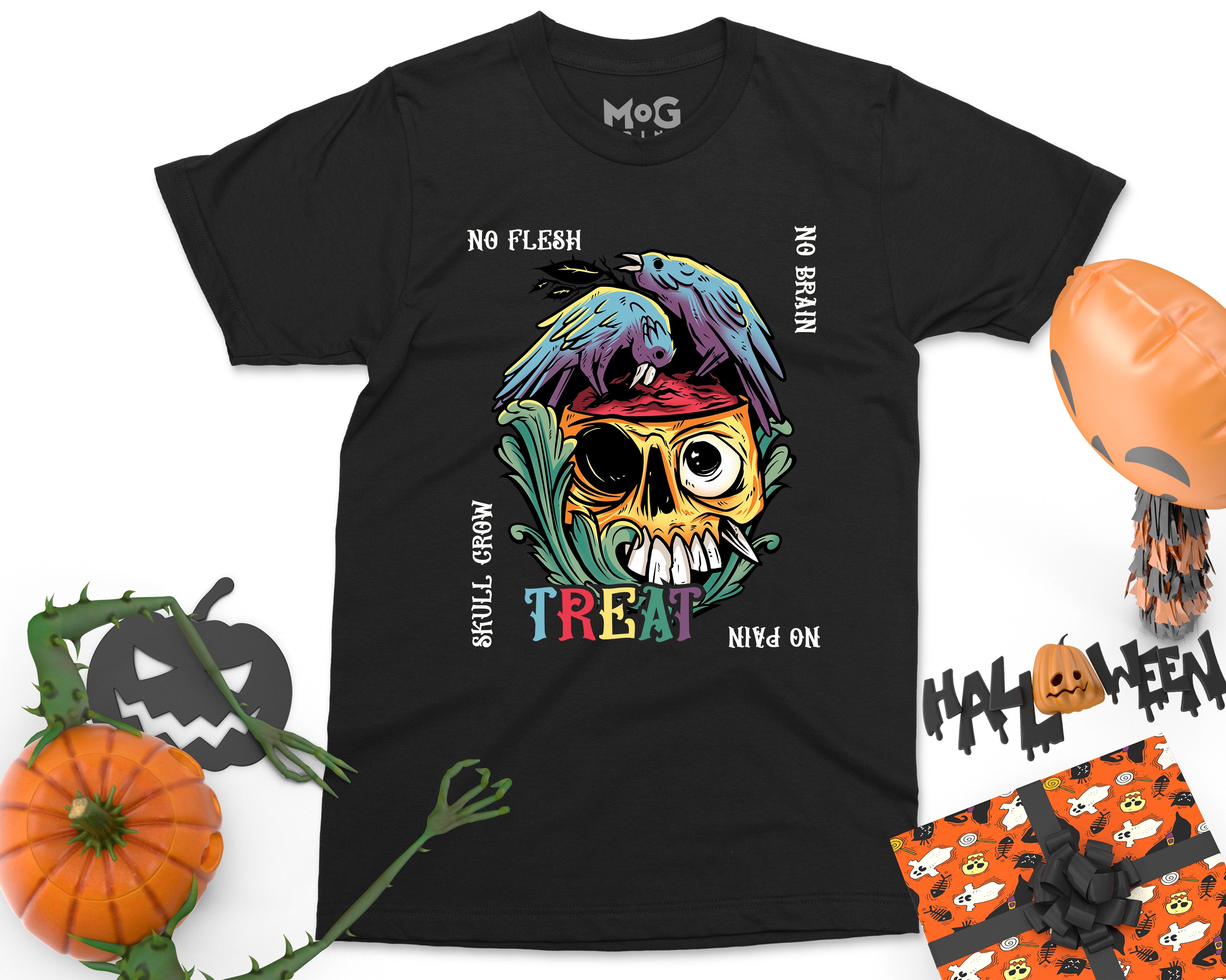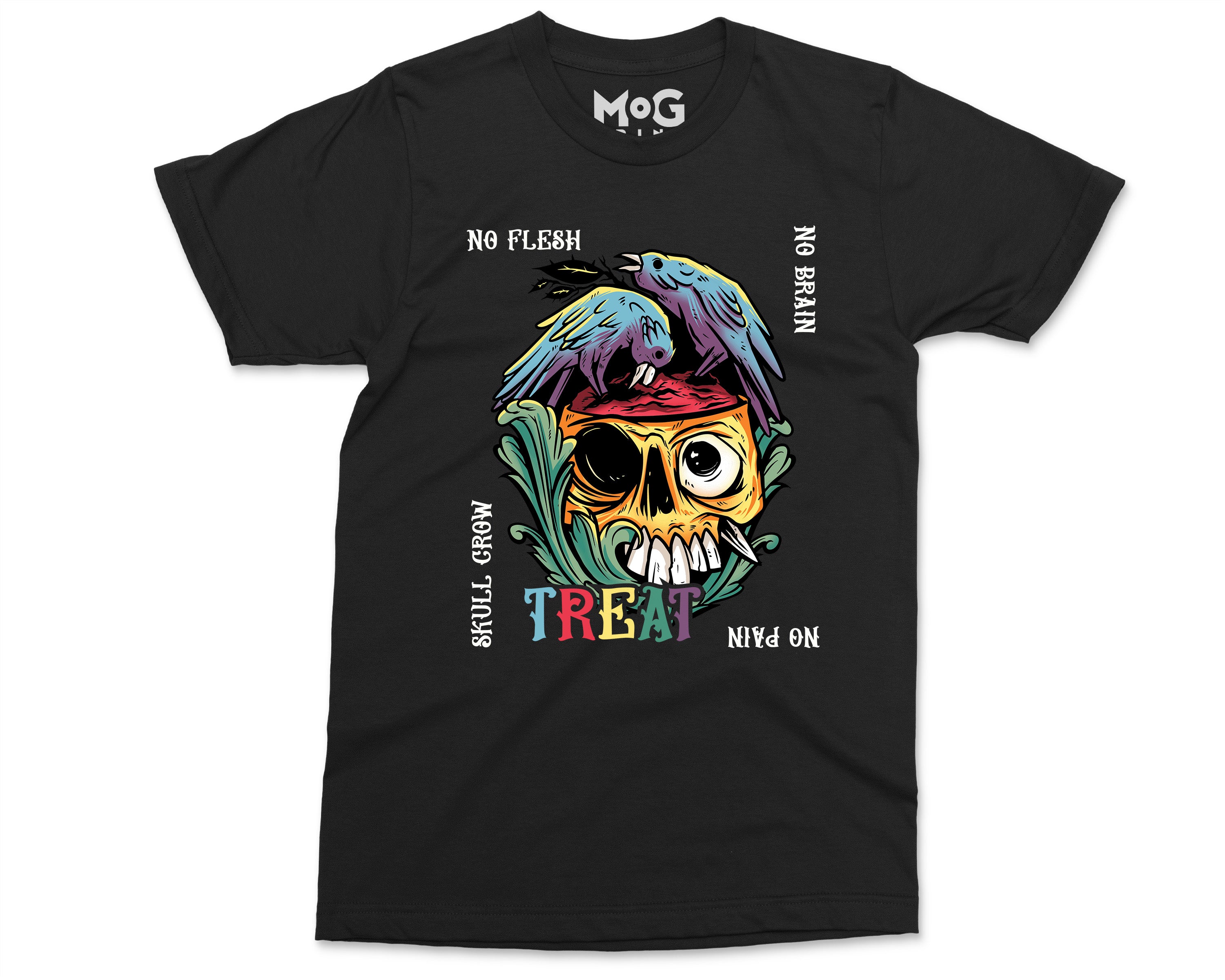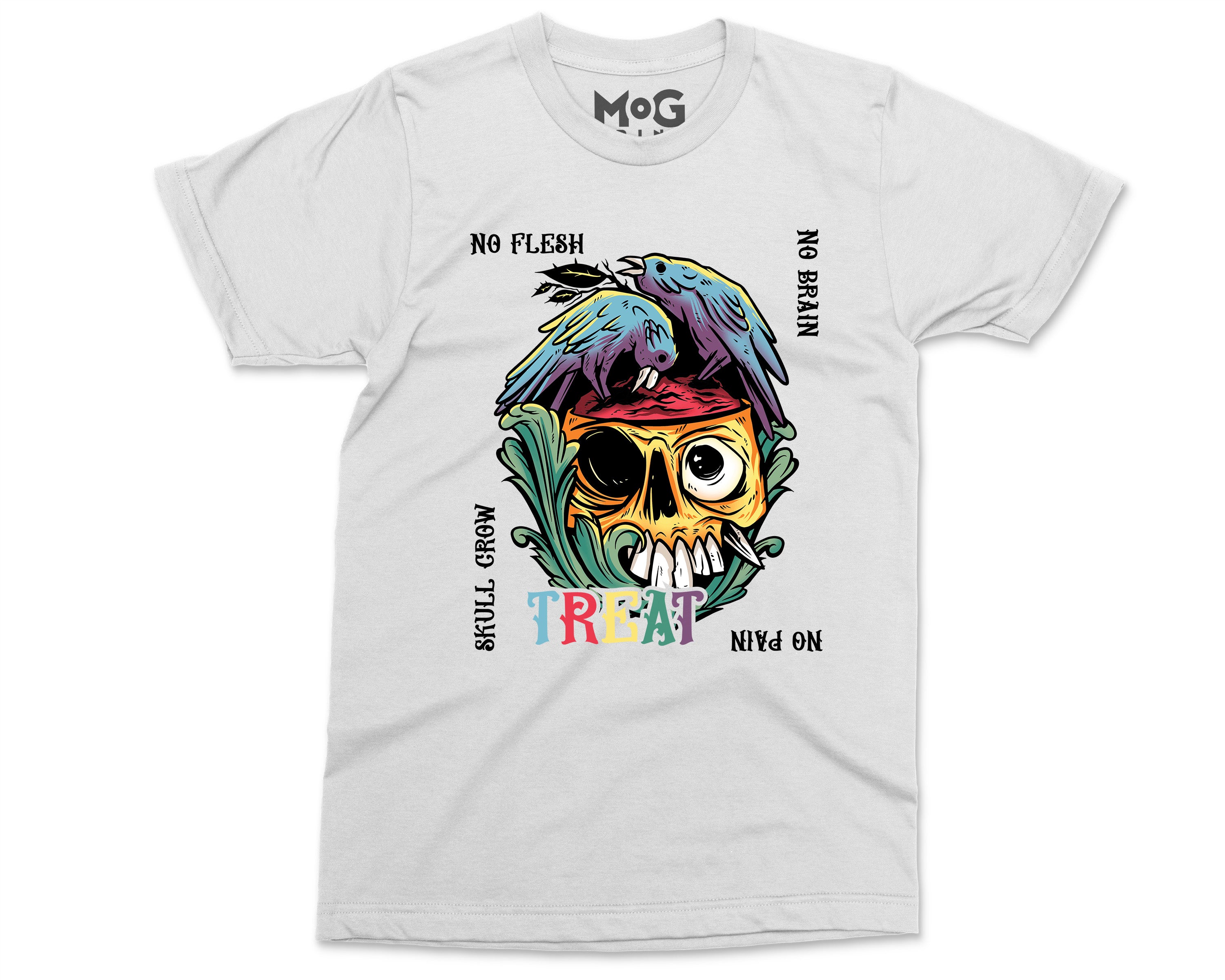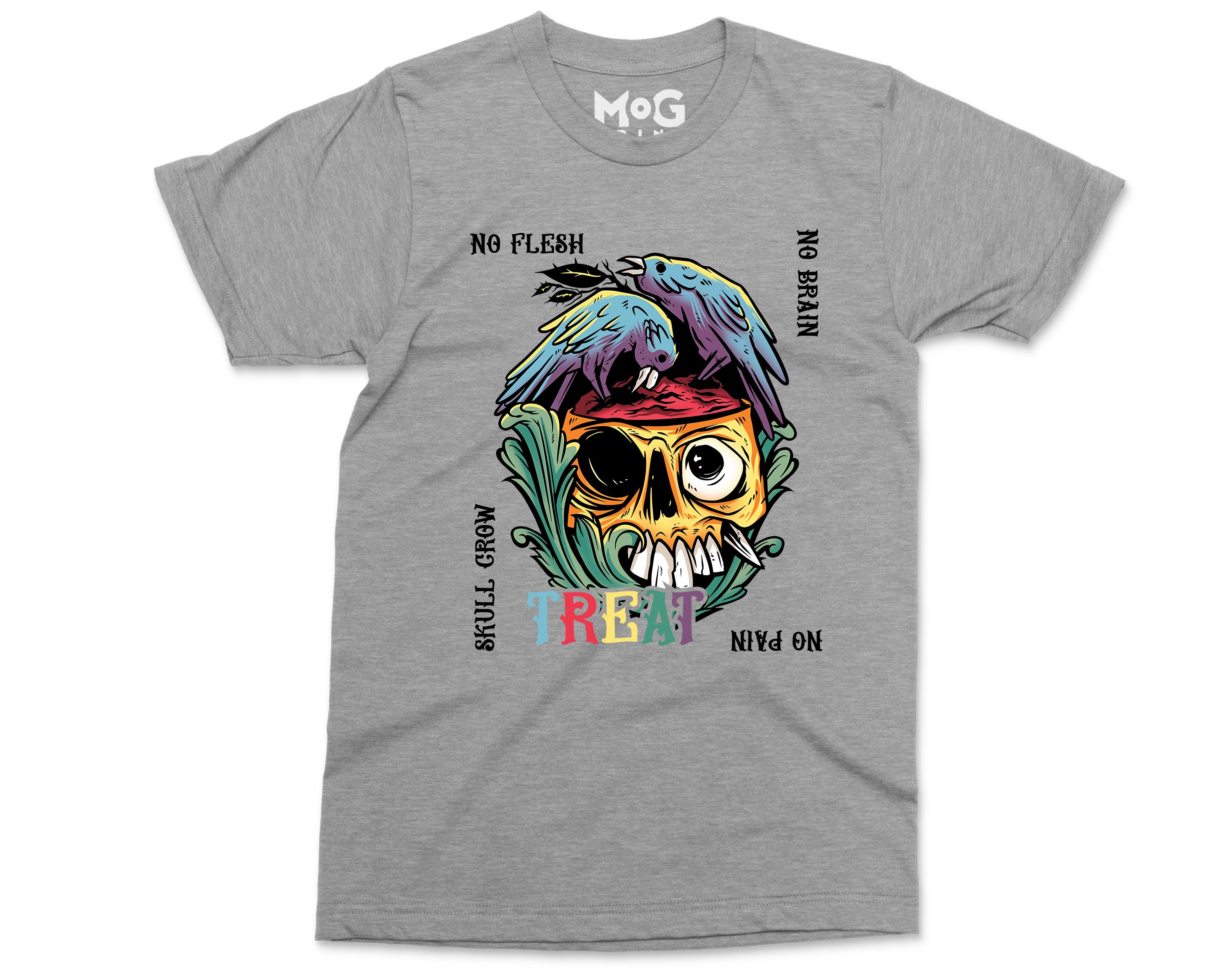 No Flesh No Brain No Pain Halloween T-shirt, Skull Carcass Birds Shirt, Halloween Gifts Scary Horror Graphic Halloween Shirt for Men Women