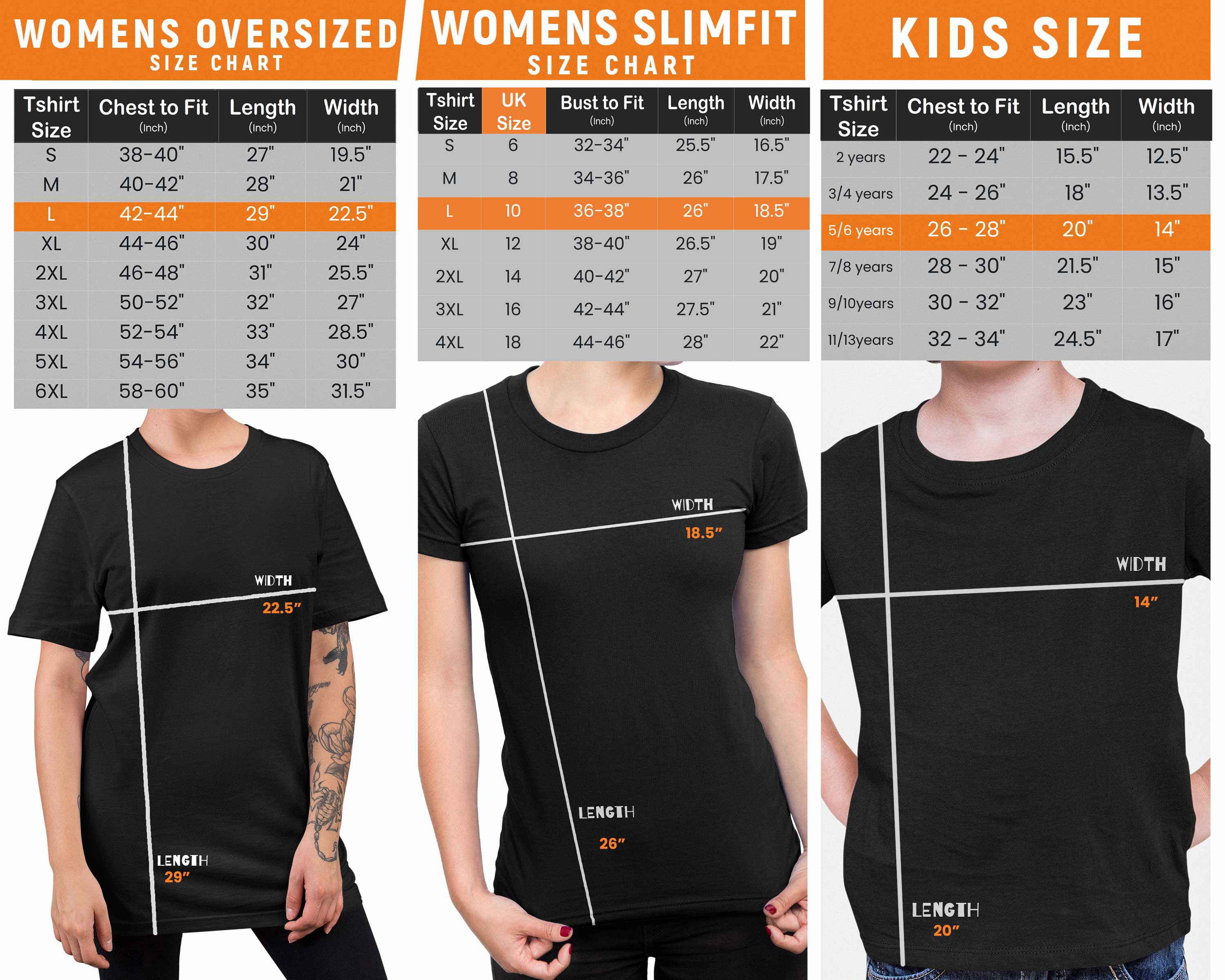 SIZE GUIDE See size guide for measurements Please note all Ladies T-shirts are SLIM FIT petite style (for a looser ladies fit, go one size up) For a looser fit we recommend men's/Unisex sized t-shirt (see size guide for dress measurements)